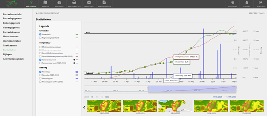 - Automatic calculation of growth stages (emergence, flowering, maturity) based on temperature sums